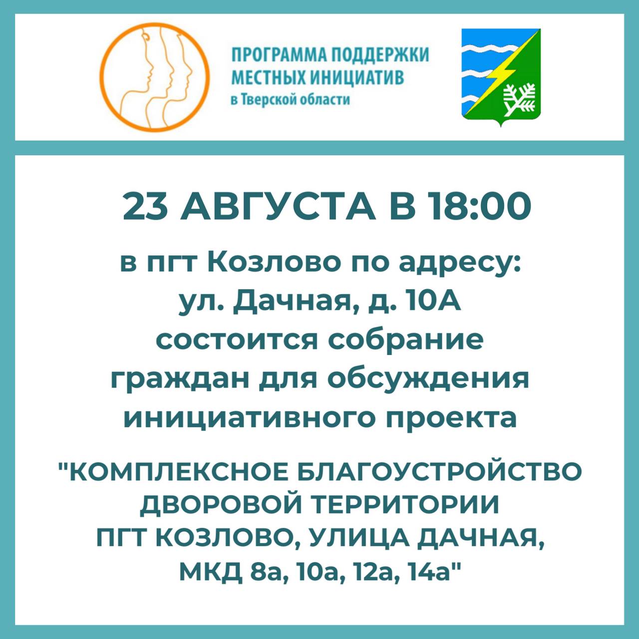 Инициативная группа, созданная для реализации инициативного проекта «Комплексное благоустройство дворовой территории пгт Козлово, ул. Дачная, МКД 8а, 10а, 12а, 14а» приглашает вас на собрание граждан, которое состоится 23 августа 2024 года в 18:00.