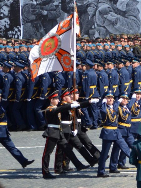 Вместе с ребятами из Тверского суворовского по Красной площади 9 мая прошли еще суворовцы Москвы, та также нахимовцы. Один строй курсантов называется «коробкой» и в нем идут ровно 120 человек, ни больше, ни меньше. Илья шел правофланговым знаменной группы. Он продолжает: