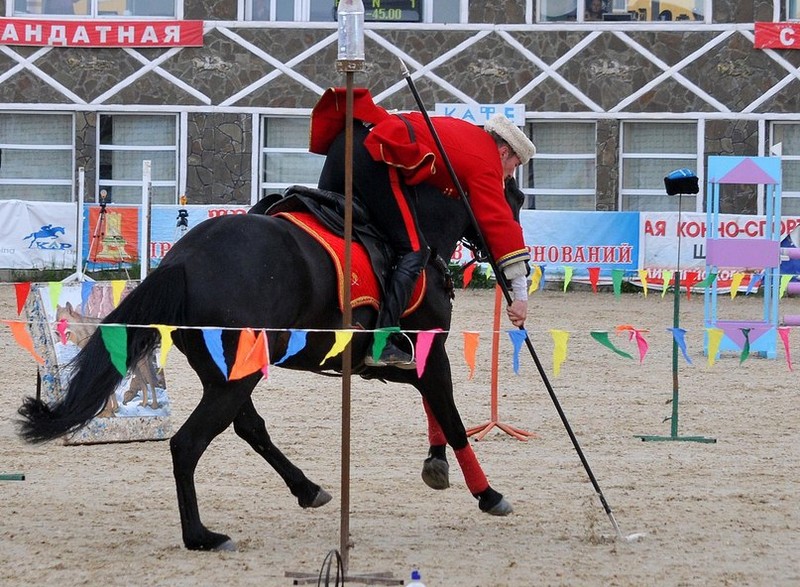 Зрителям в КСК было на что посмотреть – красивые лошади под музыку легко преодолевали сложнейшие барьеры. Особенное внимание вызвало выступление каскадёров. Всадники, наряженные в казацкие одежды, показали чудеса джигитовки: стрельбу по цели на ходу из пистолета, лука, мастерское владение пиками, саблями, хлыстами.