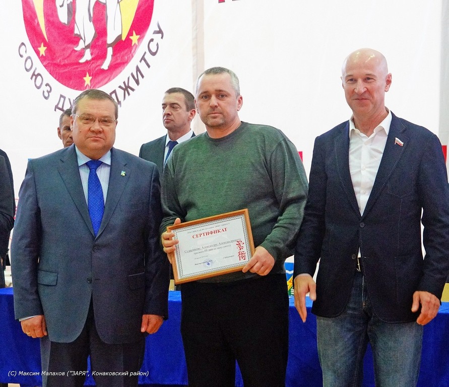 На открытии все выступили с приветственным словом, а К.И.Буевич вручил сертификаты на присвоение Данов в джиу-джитсу Соколову А.А, Сударикову А.А (директору ДЮСШ "Единоборств" Конаковского района), Расол Ю.С - ( спортсмен- инструктору ДЮСШ "Единоборств" Конаковского района),