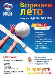 15 июня в 10 часов 30 минут состоится турнир на кубок партии «ЕДИНАЯ РОССИЯ» по летним видам спорта. В программе – пляжный волейбол, дартс, стритбол. Организаторы обещают также устроить зрелищное шоу – запуск воздушных змеев. Всего предполагается участие нескольких десятков команд, а призы будут вручаться в 75 номинациях. Спортивный праздник продлится до вечера, мы ждем вас!